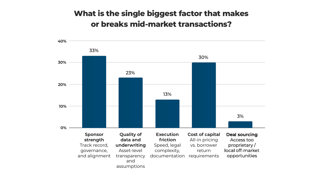 The survey results highlight that sponsor strength is considered the most critical factor in making or breaking mid-market transactions, with 33% of votes. This reflects the importance of a sponsor's track record, governance, and alignment, signalling that investors place significant value on the reputation and reliability of those leading the transaction.