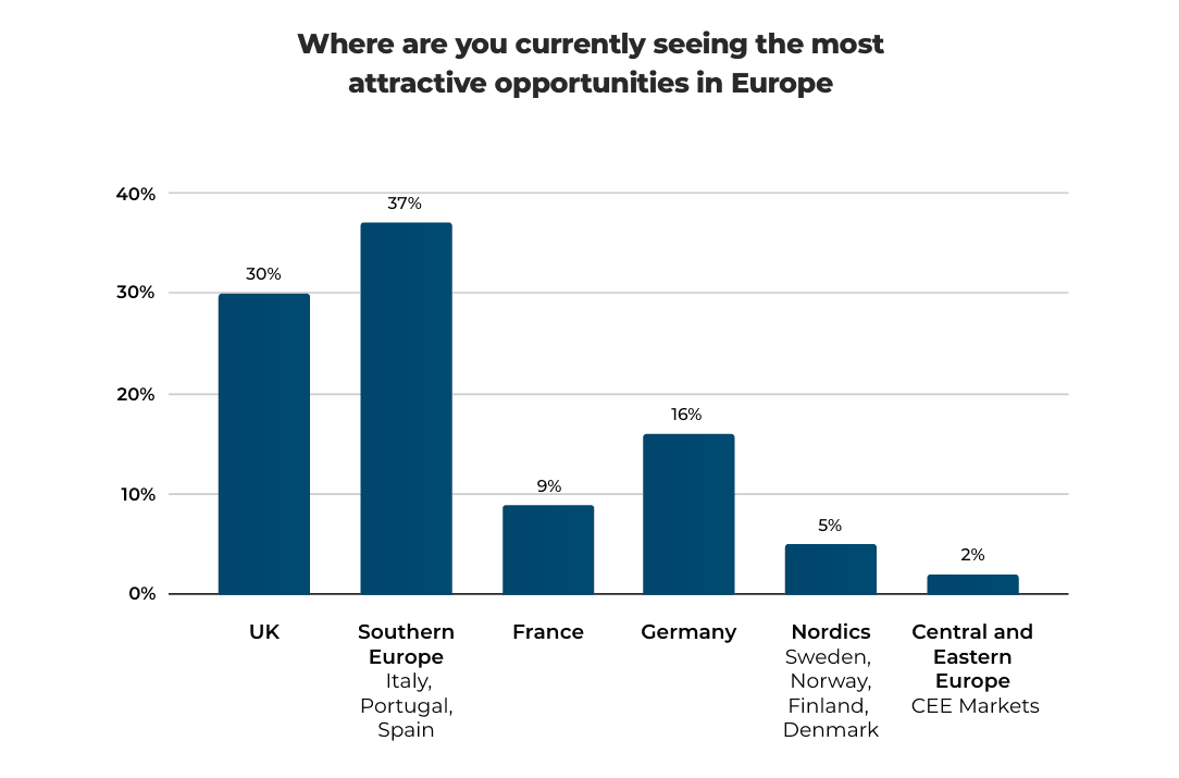 The results clearly show that the most attractive opportunities in Europe are concentrated in Southern Europe and the UK, with significant interest in these regions. Investors seem to be gravitating towards markets that offer potential for growth and favourable conditions, particularly in regions with a strong recovery trajectory and increasing market stability.