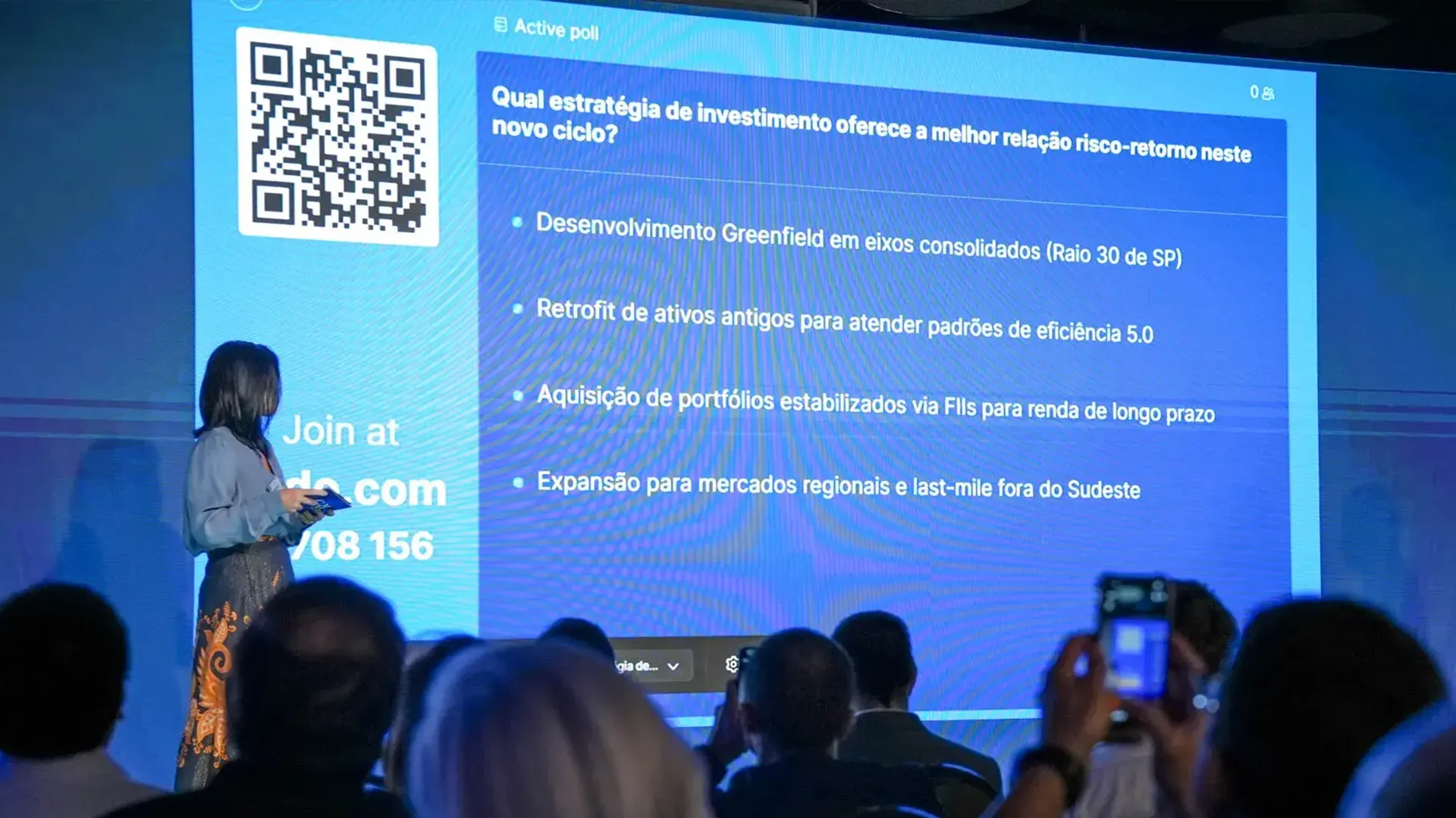 Enquete realizada no encontro aponta que apenas 14% optam pela aquisição de portfólios estabilizados no cenário atual, enquanto 33% apostam em desenvolvimento greenfield no raio 30 de São Paulo e outros 37% enxergam que a melhor relação risco-retorno está na expansão regional.