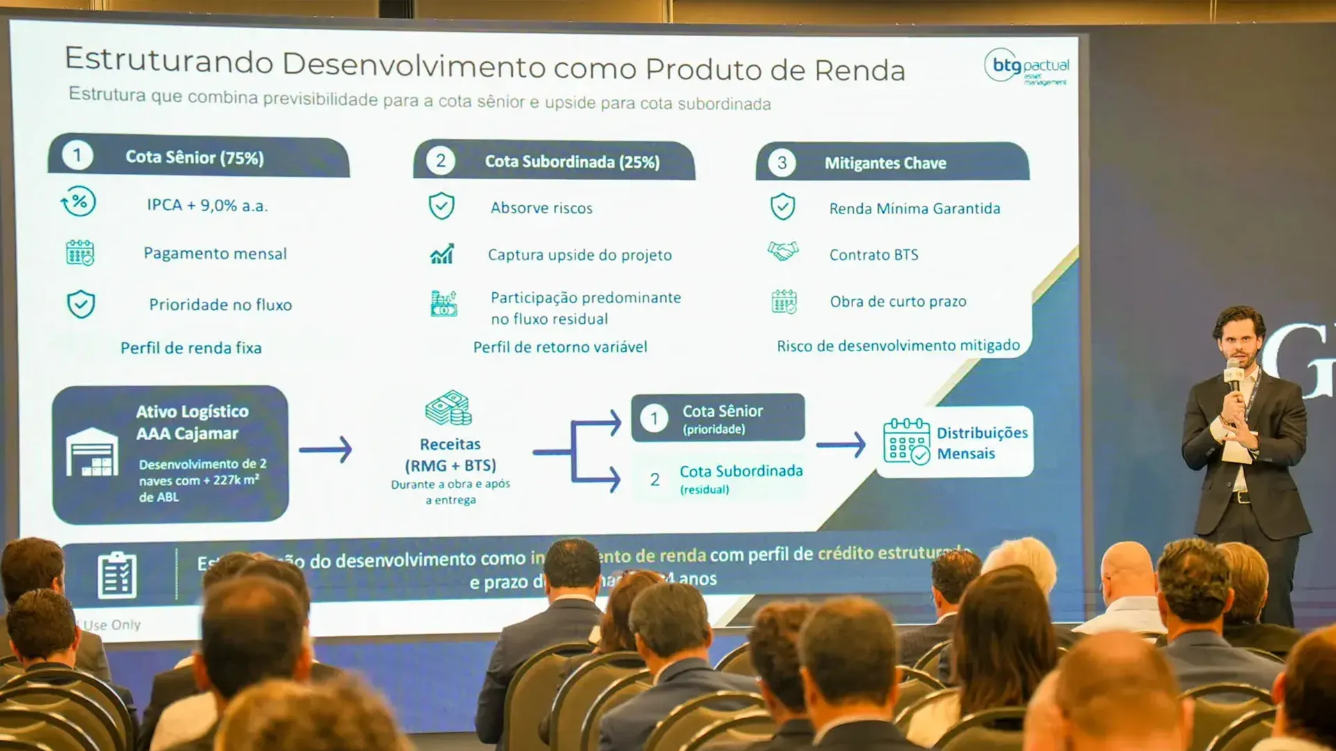 Francisco Tavares, diretor do BTG Pactual, apresenta detalhes da estruturação de um FII de desenvolvimento built-to-suit (Foto: GRI Institute)