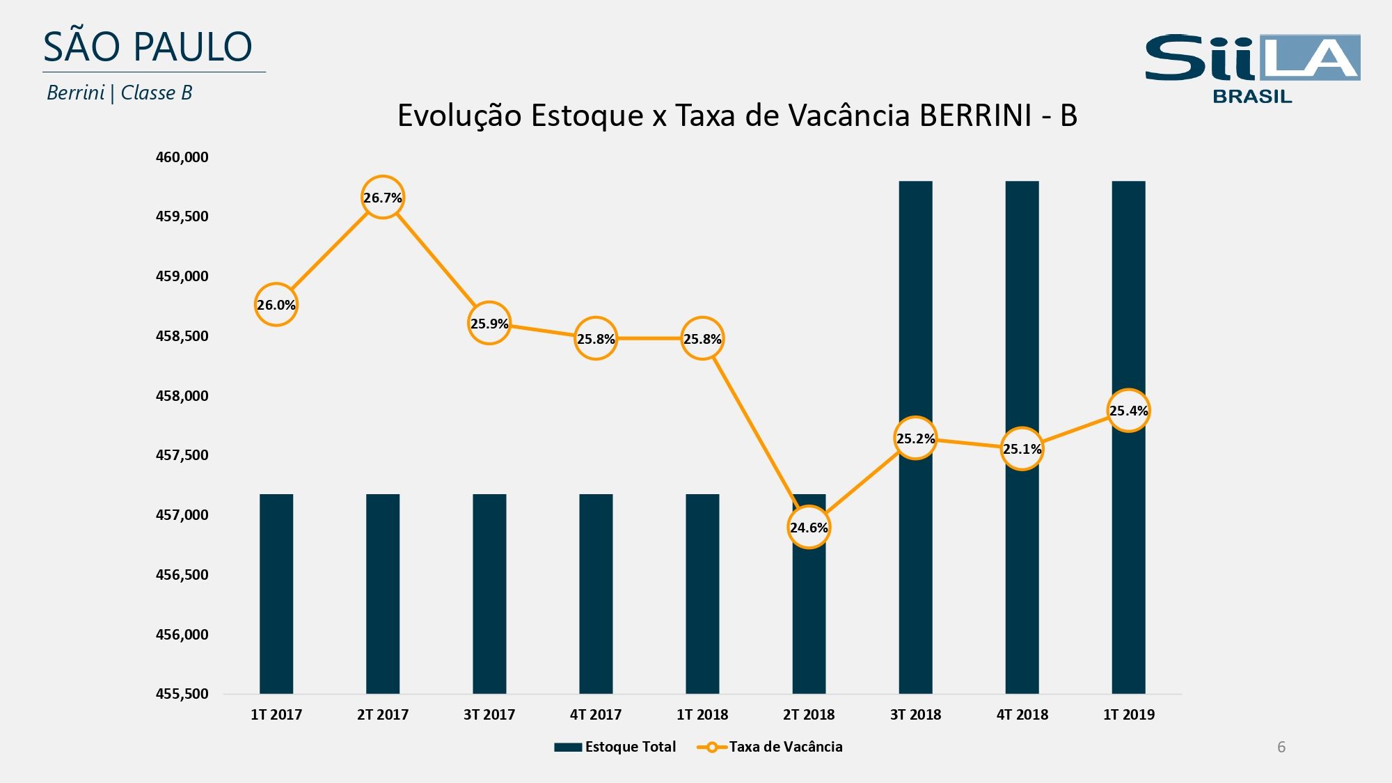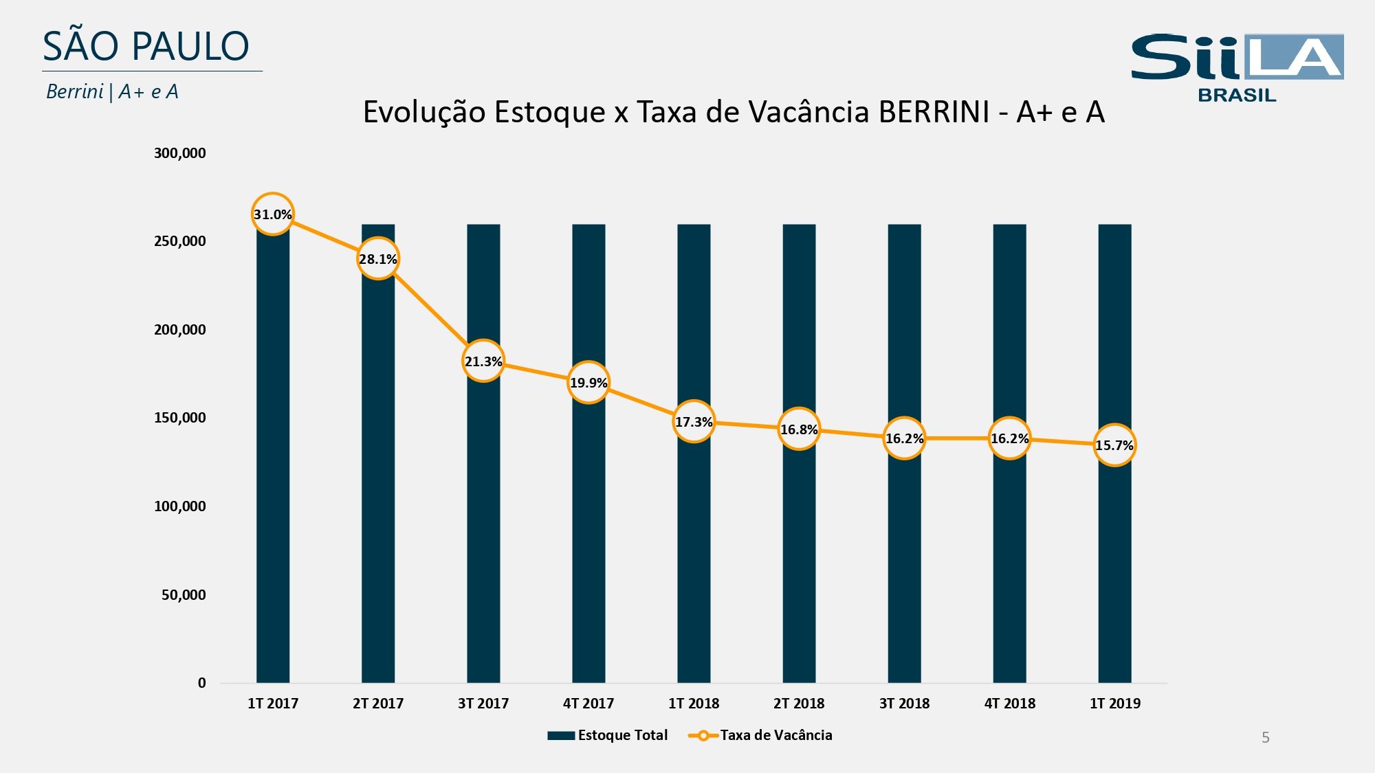 Todavia, a via citada, ainda conforme o estudo da SiiLA, apresenta 21,3% de taxa de vacância para imóveis classe A e A+ e 32,1% para prédios B (primeiro trimestre de 2019). Dois anos antes, esses números chegavam a 26,4% e 34%, respectivamente.